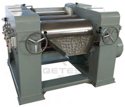 该机通过机器水平方向排列的三根辊筒的表面相互挤轧及不同速度的摩擦而达到研磨作用,研磨物料一般只需研磨二次就可以达到要求,难研磨物料要研磨多次,方能达到要求,加工细度一般可达到3-18um左右(用细度板测定)。